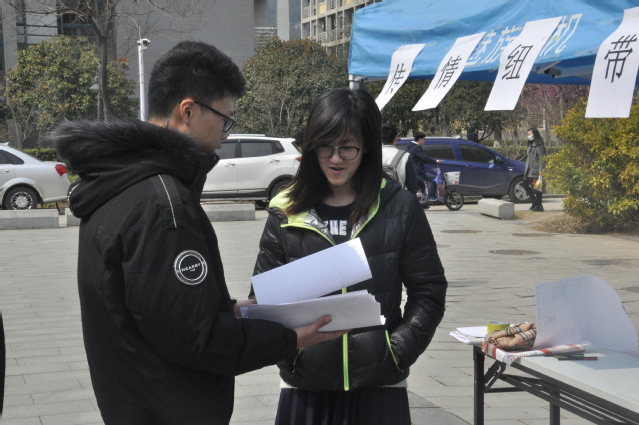 中午12点,宣传活动正式开始,服务分队的干事们早已在三食堂广场布置好场地。在服务分队副部长张远健的带领下,干事们向过往的同学们发放活动传单,并详细介绍活动内容、活动目的、活动日期等相关事项。