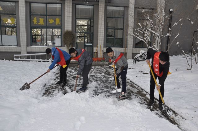 志愿者们携带铁锹、簸箕、扫把等工具在梅3一楼大厅集合完毕。11点20分,扫雪活动正式开始。在凛冽的寒风下,志愿者们积极主动、相互配合,挥舞着铁锹和扫帚,你铲我扫,一点一滴地清扫后院道路道路上的积雪。尽管天冷路滑,志愿者们一直没有离开清雪现场,从扫雪初一直坚持到扫净雪。看到自己的努力成果,志愿者们露出了满足的笑容。志愿者们齐心协力,分工合作,配合默契,充分阐释了“团结、友爱、互助、奉献”的志愿者精神。