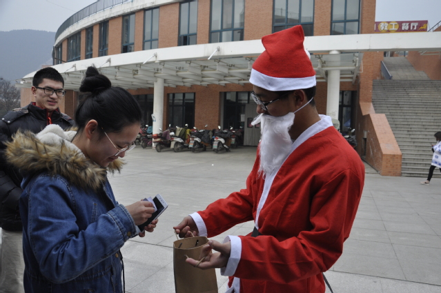 服务分队的工作人员早早就在活动现场设置募捐箱,以便于同学们献出爱心。服务分队成员们积极为活动作出宣传,工作人员穿戴圣诞老人套装,为过往的同学介绍活动的形式、内容以及意义,吸引了许多热心、富有爱心的同学参与捐赠。本次活动准备了丰富的圣诞礼物,包括学生们的祝愿贺卡、圣诞帽和礼品盒等。当同学们捐赠后,还获得了精美的小礼品。