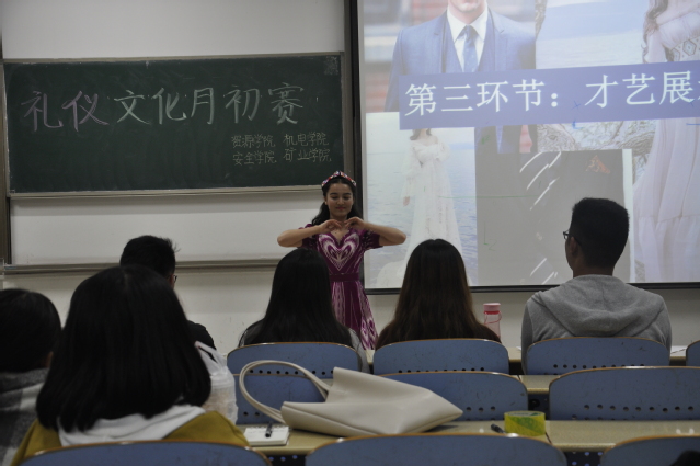 本次比赛分为三个环节,第一个环节是由各位参赛选手进行T台走秀。在明快的音乐映衬下,选手们纷纷登场亮相。男生们英俊潇洒、风度翩翩,女生们貌美靓丽、举止高雅,赛场顿时散溢着青春与活跃的气息。随后,便是知识竞答环节。选手们在银幕前一字排开,对着银幕上出现的问题进行细致的分析和激烈的抢答。在这个环节,大家不仅展现出了自己的礼仪文化底蕴,也学到了很多之前所不了解的礼仪知识。最后,各位参赛选手给大家带来了精彩的才艺展示。有婀娜的新疆舞,有妙美的歌曲,有动人的朗诵,也有别具新意的哑剧表演。同学们充分的展示着自己的才华,将赛场的氛围推向了高潮。在一片欢声笑语中,礼仪先生小姐选拔出赛落下了帷幕,而礼仪文化知识却永远回荡在心间。