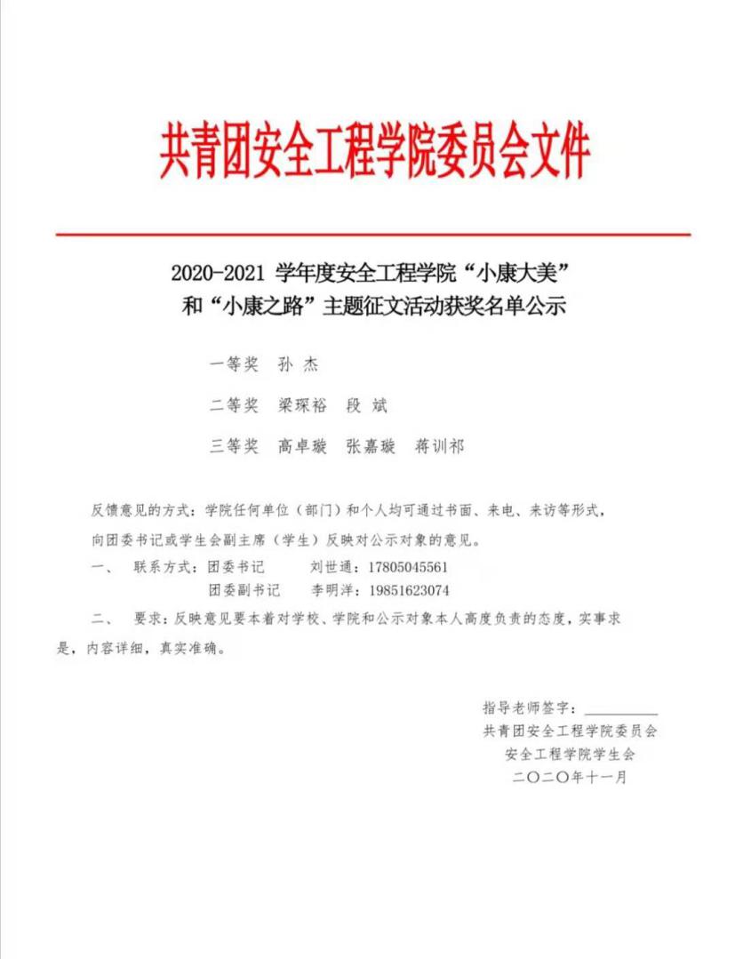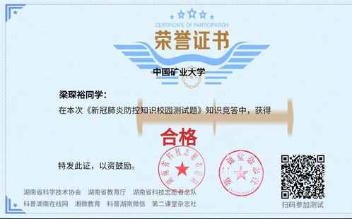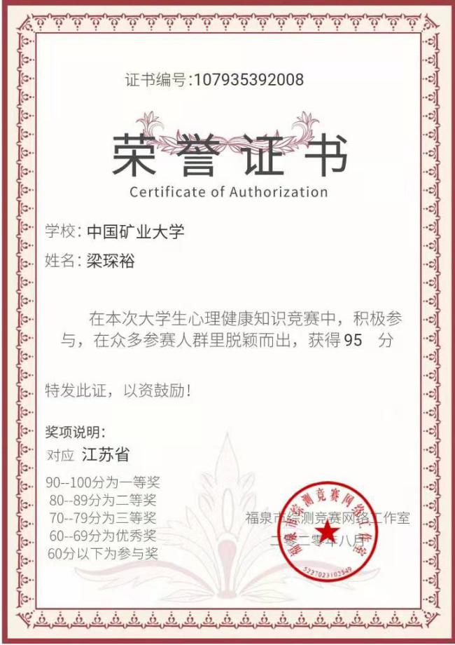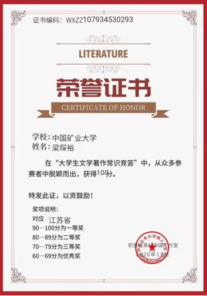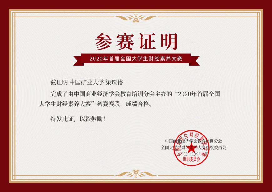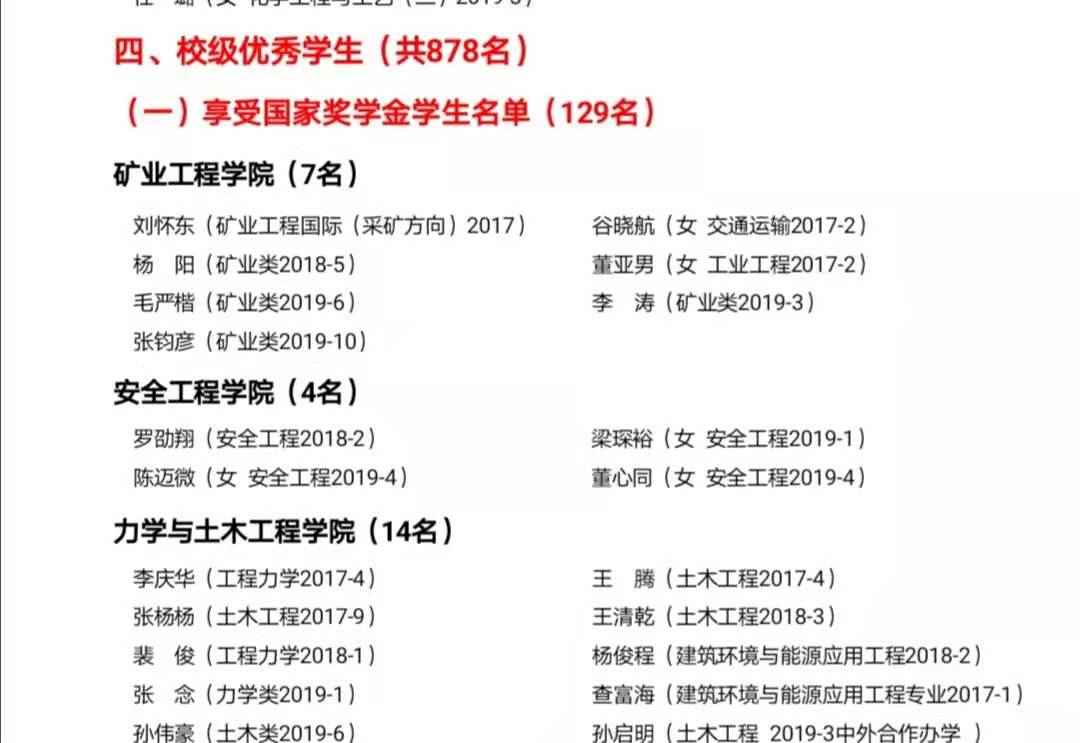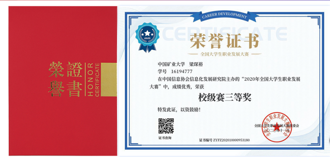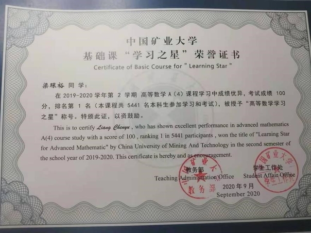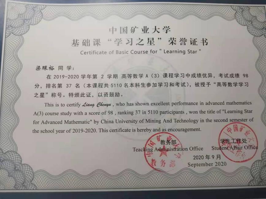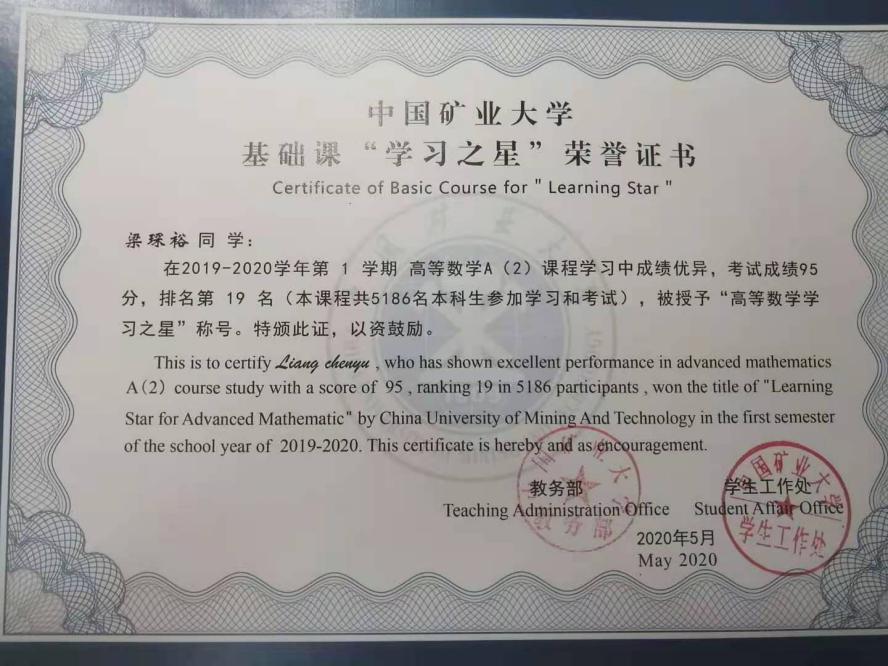 我获得2019-2020年度家励志奖学金,获得“瓦斯-好学”奖学金,三次获得中国矿业大学基础课学习之星,已通过英语四级、计算机二级考试。