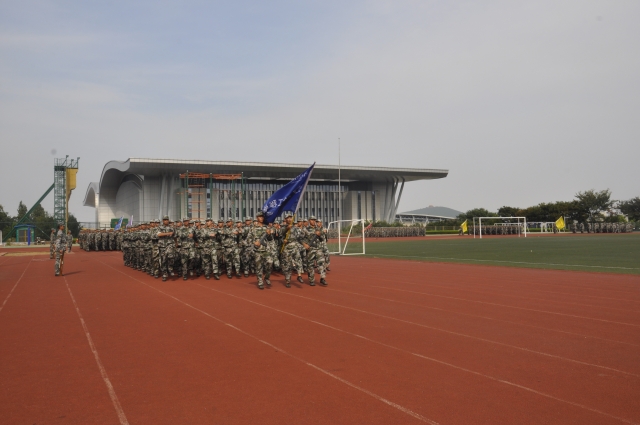 方队整齐划一、步调一致,安全学子朝气蓬勃、昂首挺胸的走过主席台,展现了安全学子良好的精神风貌。分列式结束,各个方队分别表演了棍术、军体拳第一套、坦克兵体操等,经过了为期两周的训练,各方阵井然有序的进场、表演、退场,动作浑然天成,表演者精神焕发,都拿出了自己最好的状态。最后教官们为大家带来擒拿格斗匍匐拳和匍匐刀的表演,表演生动有力,蔚然成风。