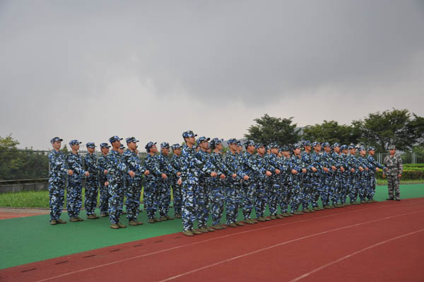 在阴雨天中,同学们并没有歇着,而是将所学的稍息与立正,跨立与立正,报数,停止间转法,齐步走等训练科目进行了练习。训练时,教官将每一项训练科目的要点进行重申,然后一一指出同学们所存在问题,进行纠正,尽管在雨中,同学们依然认真刻苦地进行训练。同学们在跑道上将每一个动作都进行了认真的训练与分解,细心地听着教官的讲解,仔细地做着每一个动作,大家都将自己置身于真正会操表演的场景中。