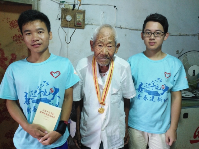 张守信老前辈今年已有92岁高龄,他于1944年入伍,当时的他仅有14岁,谈到入伍前的家庭状况,老前辈说道:“小的时候家里穷,上不起学,认字少,不像现在都上学,那时候只有有钱的地主上学。也没啥吃的,经常吃一些红薯干,能吃到都算好的。”入伍之后,生活比较艰苦,老前辈说:“那时候没有时间学习,坏人紧跟着我们,饭都吃不上,那时候坏人多,夜里都不敢睡觉,我肩上受过伤,当时白天就站岗,晚上坏人就跟着我们。一提到这些事,我就抹眼泪。有个和我一起的也牺牲了,和鬼子拼刺刀,一个连的人都没了。回忆那时候,那时候都吃一些红薯干、豆子、红薯煎饼。那时候武器也不行,比不上别人的武器。”因为抗战打鬼子,老前辈耳朵被震聋了,现在跟儿子儿媳生活在一起,生活很艰辛。采访结束,老前辈向志愿者展示自己的纪念章并与志愿者亲切合影,还叮嘱志愿者说:“你们都是青年人,是共产主义的接班人 ,要好好珍惜现有的生活。”