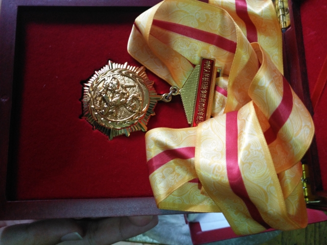 张老前辈向志愿者展示纪念章