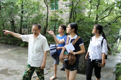 下午三点,烈日炎炎,实践团的成员们又一次踏上了了解旧址背景的采访之路。在采访过程中,一位老人热情得知调研团是矿大学生后并了解团队的来意后,热情地向调研团介绍这里建筑的历史和他们在这里几十年的概况,并主动地带领团队成员上山了解具体情况,一路上讲述了这里许多被时间冲淡的往事。老人姓胡,是川煤十处的退休职工,现居住在矿大旧址改造而成的居民房红旗二楼中。胡爷爷虽年过古稀,但依旧精神矍铄,由于自78年矿大搬迁后,他们就携亲眷搬迁至此,他对老矿大修建的前后背景十分了解。他16岁就参加工作,后面也曾参军,随后来到川煤担任修车员。在与他亲切交谈的同时,胡爷爷带领团队成员到达山顶,站立在原矿大修建的蓄水池之上,一眼望去矿大旧址和山下的三汇镇尽收眼底。老人讲述,当年正值特殊历史时期,矿大是由矿大老师甚至老教授们,同当地民工一道,亲自修建。修建过程在物质匮乏,技术落后的年代异常艰辛。据胡爷爷听更老一辈的人描述,他们肩扛背挑,汗流浃背,筑起一道道围墙,一幢幢房屋。胡爷爷还提到,这里虽然看似穷山恶水,但老矿大的建筑分布和很多细节都是很考究的。同现在的矿大一样,讲究风水布局。这些房屋也是用石料一丝不苟地砌成,非常牢固,自六十年代末历经近五十年的风雨依然屹立于华蓥山东南麓。采访结束,胡爷爷坚持亲自送团队成员到原矿大校门,随后与老人握手惜别。队员向胡爷爷保证,一定会尽我们最大的努力,保护这些用老一辈矿大人的汗水筑成的建筑不被损坏。