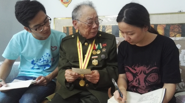 上午九时许,志愿者们来到于占伟老前辈的家中,得知志愿者们来采访抗战事迹,他说:“每次回忆起战火硝烟的年代,我心里既难过又高兴。”于老前辈今年87岁,仍思路清晰,身体硬朗,他随后讲述了自己从参军到抗战的人生经历。于老前辈老家在安徽泗县,家里是上中农,并不算穷,但也经常受地主压迫。父亲没有兄弟,老是受别人欺负,再加上看到日军到处屠杀,当年只有14岁的他听说村里有个当兵的,便想着一起去“闹革命”。于老当时参加的是区大队,条件极其艰苦,不发衣服,连鞋子都没有,站岗、打仗都是赤着。当兵第三天,日军派70多名伪军到城南大李庄抢粮,部队前去阻止发生激烈战斗。于占伟也上了战场,当时的他因为年幼还有些许害怕,但看到战友们英勇奋战,他备受鼓舞。回忆起最艰苦的时期,于老前辈现在仍记忆犹新,他说:“当年日伪军兵分五路,派出骑兵、坦克、飞机、汽船等精锐部队对淮北抗日根据地进行大‘扫荡’,企图消灭我军主力,当时条件特别艰苦,冬季寒冷,吃了上顿没下顿,白天黑夜行军,手脚都冻得长满冻疮,困了就在路边休息一会,起来接着走。一夜换几个地方,稻草就是我们的床,但我军战士浴血奋战,不怕牺牲,历经33天,我军获得反扫荡全部胜利。”后来,于老因为念过私塾,被派去卫校学医。学医归来,于老来到淮北第六医疗队成了一名军医,在前线救护所救治伤员,人手少的时候就上战场杀敌。新中国成立之后,他获得了纪念抗日战争胜利独立自由奖章和抗战胜利60周年勋章。时至今日,于老前辈也不忘抗战,他时常到社区参加公益活动,给大家讲述抗战历史,让更多人知道那段难忘的岁月。采访结束后,于占伟老前辈向志愿者们展示了自己的勋章,并与志愿者们亲切合影。