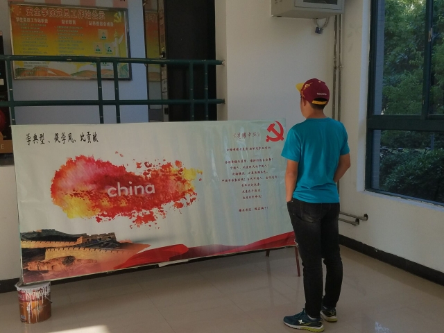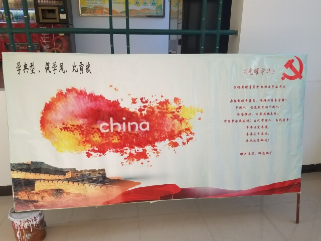 积极响应国家号召,展出了这一爱国主题展板。此次展板采用白色为背景,将展板主要部分衬托的十分醒目,令人震撼。展板内容主要分为三个板块,第一块是九个大字:学典型,促学风,比贡献。强调了大学应该以怎样的态度去面对学习生活。中间是大幅图画,一大片中国红中间是是醒目的“China”,下方则是巍峨的长城。最后一个板块则是一首现代诗《光耀中华》,诗歌的内容震撼人心,强调了中国梦的实现、未来中国的建设都要依靠当代中国人。诗歌也对当代年青人提出了建议,要求他们坚持探索,一直向前。