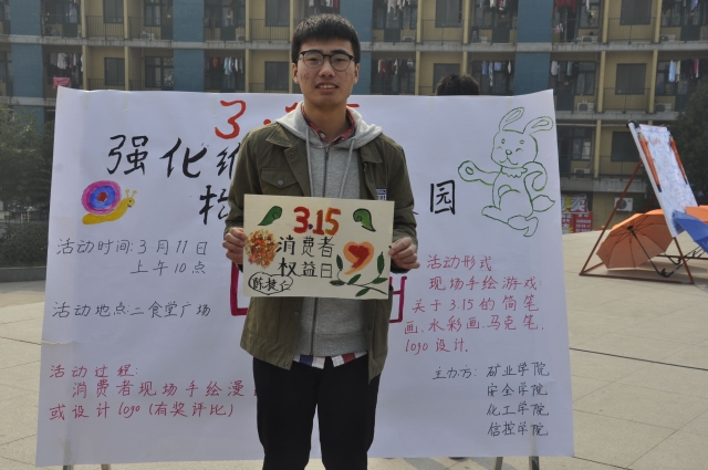 上午10点,活动正式开始。活动内容包括设计并绘制“3.15”的logo及与“3.15”有关的图画绘制。现场工作人员积极向过路行人宣传和讲解活动规则,同学们积极报名。上交的作品内容充实,画面感强。同学们或是用简单的线条勾勒,或是用色彩明丽修饰,或是立意新颖,以表达自己对于“3.15”活动的理解。接下来,工作人员邀请了现场围观同学对参赛者的作品进行了评比,并进行了颁奖。最后,工作人员给所有参赛者分发了精美的小礼品,活动结束。