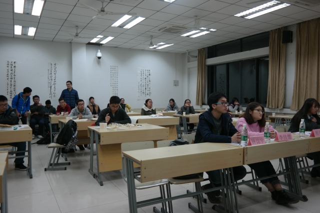 负责人布置教室,将初赛优秀的作品贴在教室的四周。 晚7点整,选手悉数到场。首先,主持人依次介绍了到场的各位评委,并讲了参赛过程中注意事项及评分标准。随后,主持人宣布比赛开始,硬笔组比赛时间为25分钟,软笔组为40分钟。参赛者们立刻进入状态,认真书写。评委们在一旁观察参赛者书写的过程。硬笔组结束后,程路主席对硬笔组参赛作品进行了总评。评委们对参赛作品一一打分后,便来到软笔组比赛现场。软笔组结束后,参赛者上台介绍自己的作品,每三人一组接受评委的点评,并进行打分。比赛结束后,工作人员将桌椅摆放整齐,清理现场垃圾。