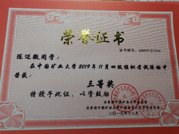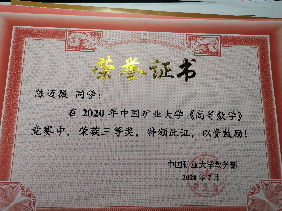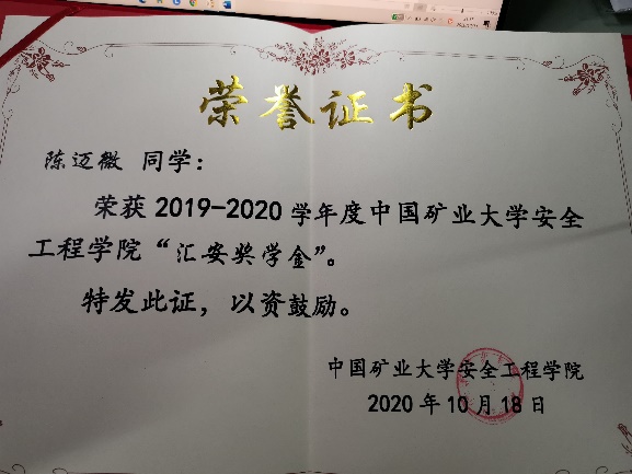 我获得2019-2020年国家奖学金,2019-2020年“汇安”企业奖学金,中国矿业大学“高等数学”竞赛三等奖,中国矿业大学“四级模拟考试”三等奖。