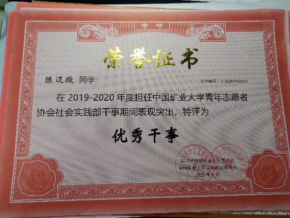 2019年我加入了中国矿业大学青年志愿者协会社会实践部,并获得了校级“优秀学生干事”荣誉。
