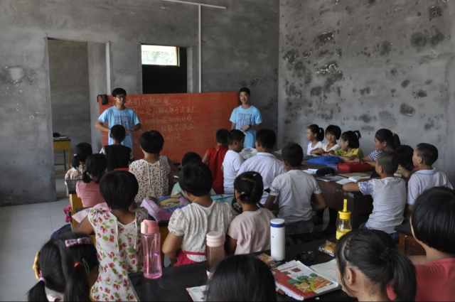 因为当地经济因素和教育环境的制约,学生们平时很少接触到音乐课,所以今天的教学课程与往日不同,支教团的老师们将为孩子们带来一堂音乐课。上课之前老师们提前准备,编写了简易的乐谱教学手册,并提前一小时来到教室,在黑板上绘制乐谱,发放手册。上课之后,周震老师先向大家简单介绍了五线谱的构成,并画了几首耳熟能详的音乐的简谱,如“小星星”,“两只老虎”等。在大家熟悉了简谱之后,老师们开始教大家一首完整的歌曲。经过学生们的磨合与不懈努力后,终于合作完成了“让我们荡起双桨”。动听的歌声响彻校园的同时,也为孩子们带来了快乐。