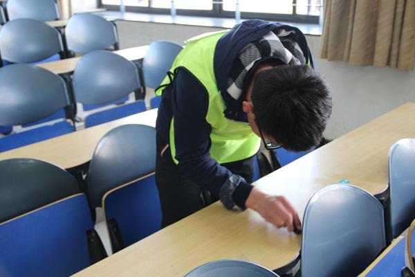 负责人将所有志愿者分成了两支小分队,分别由负责人有序地带到指定地点开始清理。在分配好相应教室后,志愿者们积极迅速地投入到清理中去,用携带的盆、桶和抹布等工具对课桌上的涂抹等痕迹进行了擦拭,难以清理的地方就用指甲努力抠掉。在清理课桌的过程中,志愿者们始终保持安静,没有对自习的同学造成影响。虽然任务量很大,但是志愿者们服务热情高涨,在志愿者们的努力下,两个区域的教室课桌很快焕然一新。下午四点,活动顺利结束。
