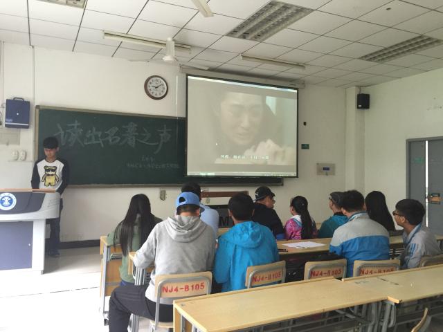 上午八点,活动在主持人对规则的再次讲解下正式开始。紧接着,主持人放映出了两个参赛选手们需要配音的影视片段以供选手们适应,这两个影视片段分别选自于《活着》、《平凡的世界》。放映结束后,各组选手对应着屏幕以及赛前所读名著的人物情感即兴发挥。有一组选手配音的是《活着》中凤霞难产的片段,其中配音家珍(凤霞母亲)的同学将家珍对凤霞的呼喊以及即将失去女儿的无奈和悲伤表现得淋漓尽致,仿佛身临其境一般。配音结束后,参赛选手对所选取名著中“最影响他们的一句话”为主题进行分享。有同学选取了《平凡的世界》中“黄河水总有清的一天!人,不能穷一辈子。”并说:“这是这本书最令我刻骨铭心的一句话,总在我想要放弃的时候激励着我。”最后,活动在同学们的掌声中结束。