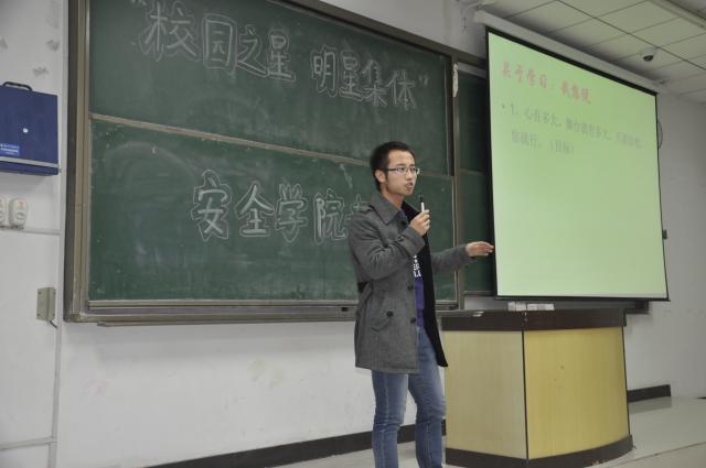 的概况并强调了集体学习的重要性。第二位是“宿舍之星”谢红娇同学,她通过ppt展示了她们的宿舍,向同学们说明了宿舍氛围对于同学发展的促进作用。接下来的是“学习优秀之星”刘凯同学向同学们介绍了许多的学习方法。然后是“科研之星”杨进林同学讲解了科研对发展同学门素质的积极作用并鼓励同学们踊跃参加活动。第五位“自强之星”张晋彰同学通过自身获得的许多成就结合学习方法向同学们讲解了确定一个目标对大学学习的重要性并鼓励同学们努力学习。最后一位上台的是“活动之星”何兴祥同学,他向同学们讲解了参加活动以及组织活动的积极意义,并从举办方角度分析同学们为何会对某些活动产生偏见,引起了同学们的深思。最后,是问答环节,在数位同学积极提问后,由何老师总结,此次讲座顺利结束。