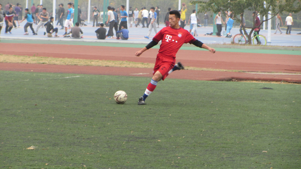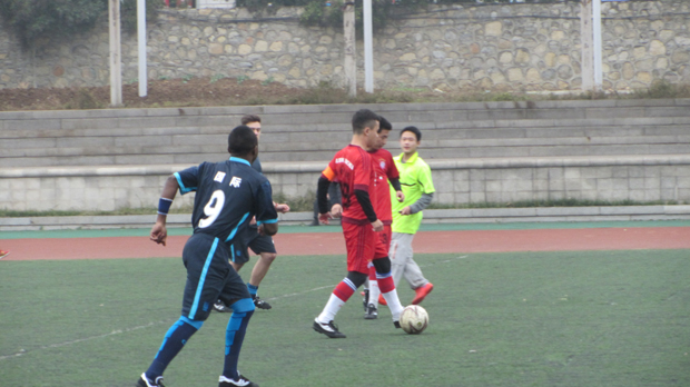 在梅南运动场进行新生足球杯八强淘汰赛,辅导员何伟民、学生会主席崔捷、副主席武文杰观看了此场比赛。