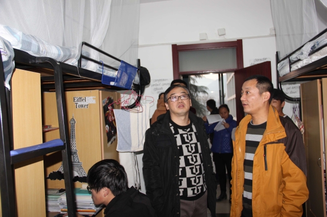 行政副院长朱晓东,安英莉老师,辅导员孙留涛老师以及孙婷老师、郑文奇老师、何伟民老师于梅三与研究生楼中深入学生生活,对宿舍所存在的安全隐患进行逐一排查。