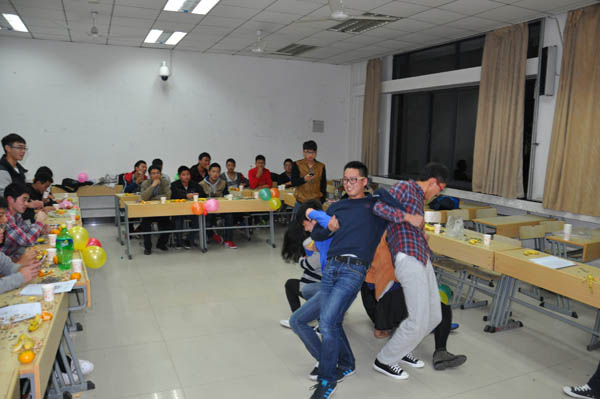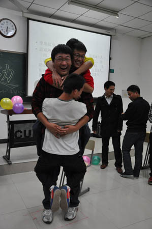 在鲁守正深情弹唱的一曲动人的《玫瑰》之后,班会进入了最精彩的游戏环节。首先,主持人将班级所有人随机分为五个小组,然后开始第一个游戏――坐地起身:所有人背靠背坐地不用手起身。最先开始由A、B、C小组进行游戏,每个组的四个人背靠背坐在一起,每个人在起来的时候无一不使尽全力,奋力的起身,有一同学由于脚滑,还摔在了地上,引起了全班同学的捧腹大笑。随后D、E两组的游戏更是笑料百出。第一个游戏结束后便开始了第二个游戏――紧紧相拥:四人站在逐次减半的报纸上,坚持五秒者胜出。在这个游戏中大家纷纷献计献策:A组有两人干脆坐在了另外两个人的肩膀上;B组的四位帅哥硬是完成了四分之一报纸的挑战;而还有E组,他们拥有大巨人刘佳狄,他的身上竟然挂了三个人,居然在二分之一大的报纸上站了五秒钟,让大家都为他们倒数计时。