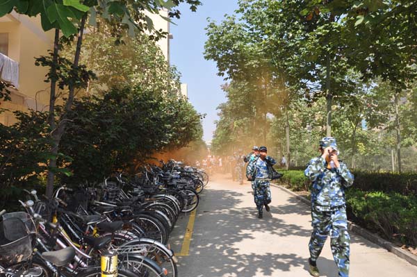 12点半,宿舍内火警警报响起,学生宿舍楼内浓烟滚滚,演习正式开始。全体新生们要求用湿毛巾捂住口鼻,弯着腰撤离火灾现场,并快速到达指定位置集合。在演习中全体新生们表现冷静,他们在疏散人员的指导下迅速、有序的沿消防通道安全出口跑出。辅导员孙婷与郑文奇则指挥各班在集合场地的排列顺序,并清点人数。随后倪炎老师在第三运动场上给同学们上了一节生动的消防知识课:她细致地讲解了如何进行报警、逃生、自救、组织人员疏散等必要知识,随后她结合校园火灾的特点着重讲解了预防火灾发生、火灾发生后初期火灾扑救、人员疏散逃生等常识,精彩的消防教育课受到了师生们的一致好评。“这次疏散虽然是演习,但是太逼真了。第一次从烟雾弹的浓雾里跑出来,要是保护不好自己,就会被烟雾呛得不知道东西南北,更别说跑出来了。以后再遇到这种情况,我就知道怎么保护自己了”,演习结束后一位同学认真的说。下午1点半,演习活动在同学们的满满收获中结束。