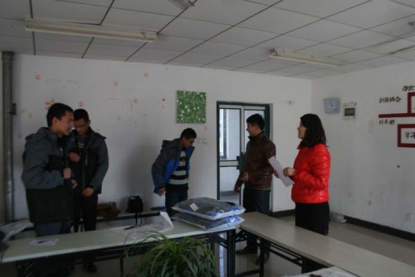 领取寒衣的同学有序地进入工作站并迅速地坐到了自己的位置上。3时整,寒衣补助活动正式开始。活动伊始,孙婷老师首先向新生了解了近期的生活状况,并且提醒同学们在日常生活中要注意保暖。而后,孙婷老师表示,希望同学们能够在感恩节向父母送去问候,感恩父母,同学们非常赞同地点了点头。接着,杨洋老师鼓励大家在大学中努力学习,在接受寒衣补助的同时不要忘记感恩社会,回报社会。