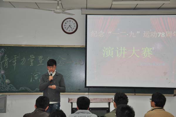演讲比赛在主持人曹蒙钰的致辞中拉开了序幕。第三位登台的陶冰冰同学是12级新生演讲比赛的三等奖,她演讲的主题是《永远的丰碑》,她的观点鲜明、见解独到,反映客观事实、体现了当代青年的时代精神。同时,陶冰冰吐字清晰、语速得当,赢得了观众的阵阵掌声。接下来登台的是崔捷同学,他演讲的题目是《乘岁月精华扬青春梦想》,他凭借嘹亮的嗓音、适当的肢体语言和完全脱稿的演讲得到了评委以及观众们的肯定。接下来登台的周晶同学和刘锰同学也分别奉献了精彩的演讲,观众们也用热烈的掌声回应他们。最后一位登台的选手是13级4班的靳振铎同学,通过《传承一二・九精神 做时代新青年》的演讲,他畅谈了自己对活动主题的理解,展示了深厚的演讲功底,同时也彰显了当代大学生积极向上的良好精神面貌。本次演讲比赛也在观众们热烈的掌声中画上了圆满的句号。