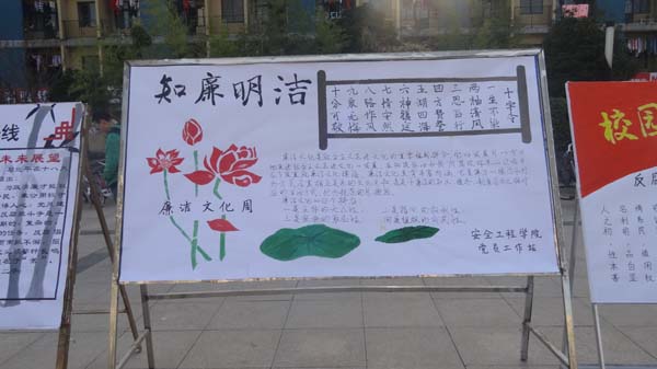 通过廉洁文化展板展出,相信同学们逐渐能领会一个全新的德育体系已经建构,马克思主义的世界观、人生观和价值观也将在广大学生头脑中扎根、发芽。同时希望师生自觉抵制各种腐朽思想侵蚀,提高党员廉洁自律意识,在全院形成一个积极向上,廉洁和谐的气氛。
