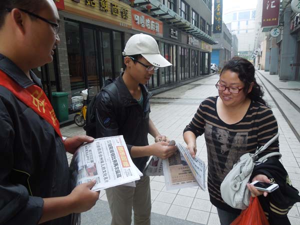 青年志愿者协会来到徐州市中心的彭城广场通过义卖报纸的方式筹集善款。