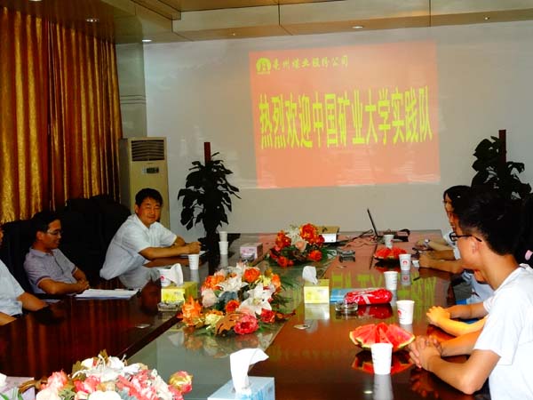 梦之队全体队员于7月13日从徐州乘坐火车前往安徽涡阳,在淮北矿业集团亳州煤业股份有限公司开展暑期实践活动。此次实践活动受到了亳州煤业股份有限公司的高度重视,公司党委书记赵峻强带领通风副总工程师常勇忠、纪检科张文勇科长,团委副书记李媛媛以及宣传部干事吕刚出席了团队见面会。
