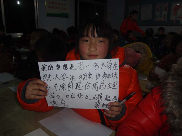 有梦想就有希望,有梦想就有未来。为了让留守儿童树立远大的理想,拥有更加美好的人生,1月24日晚,中国青年志愿者公益圆梦行动“爱心阳光之队的志愿者们组织赵河镇中心小学留守儿童们书写自己的梦想。