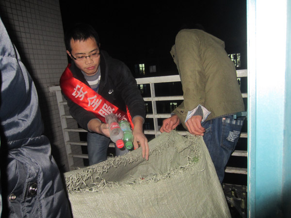 学生宿舍开始废瓶回收活动。在经过各宿舍的同意之后,队员们依次走进每个宿舍的阳台,分工合作,将同学们平日喝完饮料后堆积在阳台的废旧塑料瓶装进大麻袋。得知队员们的来意,宿舍的同学们纷纷积极帮助队员们整理,贡献自己的力量。从各个宿舍收集来的塑料瓶数量可观,加上瓶上的灰尘积聚,增加了许多工作量,但服务分队队员们任劳任怨,不到半小时的时间就将各个宿舍阳台的废旧塑料瓶清理回收干净。