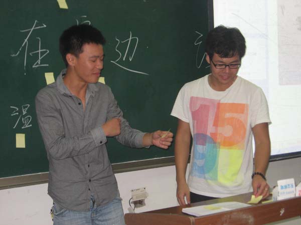 紧接着,班会进入第二个环节――“众里寻他千百度”。活动方式是将每个人的名字写在不同的卡片上,由A同学随机抽取,然后面对全班同学对所抽到的B同学的性格喜好等特征进行描述而不得透露该同学性别,姓名,寝室,家乡等信息,,然后由在场的其他同学猜测所描述的同学。该环节旨在考察班级同学间的熟悉程度。在该环节中,在场的同学表现得异常活跃,瞬间将整场班会推至高潮。