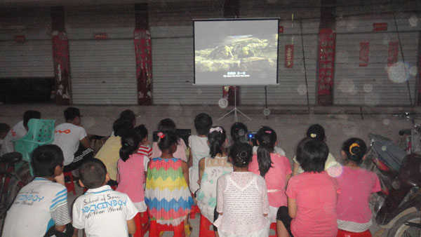 在博望镇团委的大力支持下,16日开始,实践团成员将为村里的留守儿童义务播放《动物总动员》、《千与千寻》和《功夫熊猫》等孩子们喜闻乐见的动画电影。每天晚上6点,实践团成员便带上幕布、电脑和投影仪等仪器设施,乘车前往博望镇周边的小村庄,为了孩子们能及早看上电影,实践团成员来不及休息便开始分工协作,架设投影仪、安防播放设备,还从附近村民家中借来的插线板和桌子,吸引了不少附近村民前来。村里的留守儿童看到新奇的电影放映方式,纷纷驻足观看。还有不少观众是从几里外、队员们白天开展志愿服务的地方闻讯而来的孩子。孩子们的参与性很高,他们或是站着观看,或是从家中搬来小凳子坐着,表现得尤为活跃。夏日天气炎热,蚊虫也不少,但有很多居民,尤其是那些孩子们,克服干扰,目不转睛地盯着大屏幕,坚持看完了影片。
