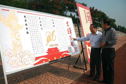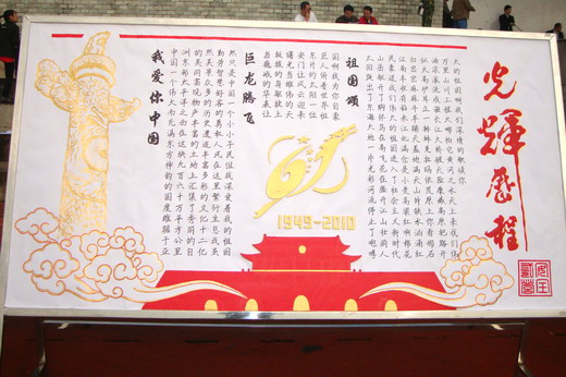 本期军训板报以“光辉历程”为主题,以巨龙幻化成“61”字样来表现共和国光辉六十一年,板报下方以祥云托起华表和天安门来表达安全学子希望祖国蒸蒸日上的美好祝福。板报整体选用红色和金色,版面整洁大方,设计新颖,给人以焕然一新的感觉。
