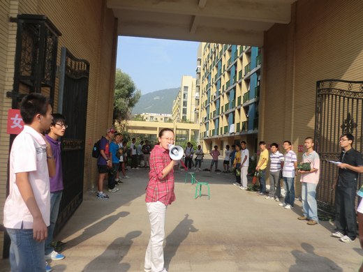 军训乃开学第一课,是新生生活的重头戏,也是新生进行身份转换的一个重要过渡。在10级学生干部的组织下,新同学们都满怀期待的来到了竹三东门。在老师和学生干部的组织,11级同学开始有序的领取军训服装,T恤,裤子,外套,帽子,鞋子,一样都不能落下,每个人在拿到自己的服装后都会仔细的清点一遍。有些同学还没到宿舍就兴奋的穿上了外套,戴上了帽子,提前感受一下军训的气氛。