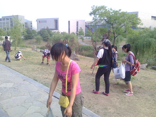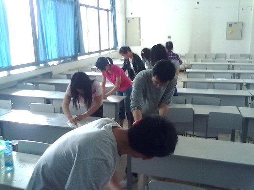楼会合。这次活动分为两个部分――擦掉自习室桌子上的字迹和污垢;到矿大北门捡竹签和垃圾。班级同学也相应的分为了两组。