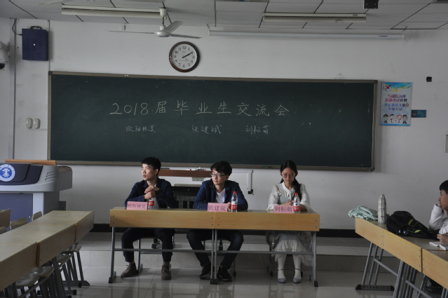 于博四三层组织开展2018届毕业生交流会。会上邀请了14级毕业生刘耘萌、张建斌、欧阳林昊等同学为17级全体同学讲述自己的大学之道和介绍安全与消防两个专业的具体情况与发展前景。