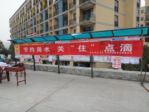 青协的志愿者们早早来到二食堂广场积极进行活动前的准备。上午10点,随着“节约用水,关‘住’点滴”的横幅在二食堂宣传栏上拉起,本次世界水日宣传活动正式开始。