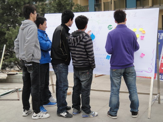 活动伊始,志愿者们通过以2011世界水日主题“城市水资源管理”为内容的展板向过往的同学普及了世界水日的相关知识;同时,志愿者们还通过印发宣传单的形式来向广场上的其他同学发起了“节约用水,关“住”点滴”的倡议书,倡导同学们珍惜来之不易的水资源。随着活动的深入,志愿者们还穿插以“知识普及,有奖问答”的小游戏,带动全场气氛的同时,也使节约用水的理念更加深入人心。活动中,同学们积极参与,纷纷在留言板上留言,并表示愿意为创建节约型校园贡献自己的一份绵力。