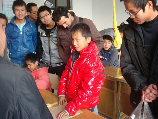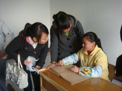 下午一点整,全班同学准时在学校北门集合,经过近两个小时的车程,同学们来到了徐州市特殊教育中心。特教中心的周主任热情地接待了同学们并给大家介绍了这里一群特殊孩子平时在教育中心里的学习、生活情况,随后又强调了和孩子们交流时应注意的问题。接着,在周主任的带领下,同学们来到了一个正在上课的三年级教室。孩子们对到访的同学感到格外欣喜,同学们走上前去给每一个孩子分发了糖果、水果并亲切的与他们交谈。虽然彼此年龄差距很大,但并不影响相互之间的沟通,小朋友们个个都热情洋溢,兴奋不已。一个名叫王帅的双目失明的七岁小男孩拿出自己的盲文课本,自告奋勇为同学们朗诵了一段课文。之后,在周主任的组织下,所有的孩子们和全体同学一起来到一个多媒体教室,自由的进行交流。孩子们积极的为大家带来了葫芦丝表演、笛子独奏等节目,同学们也频频鼓掌喝彩,赞扬小朋友精彩的表演,鼓励他们再接再厉,并给他们赠送了精美的小礼物。同学们也给小朋友们表演了很多精彩的节目,班内两名新疆同学表演了新疆舞蹈,一个叫周星东的双目失明的小朋友主动和居彦青同学一起合唱了歌曲《隐形的翅膀》。虽然这里的孩子们都存在着弱听、弱视或失明等方面的疾病,但他们天真、灿烂的笑容点燃了每一位同学心中爱的希望,他们快乐和自信的眼神使每一位同学都为之感动。下午五点钟,在与小朋友们合影留念后,同学们告别了特校的老师和小朋友们。