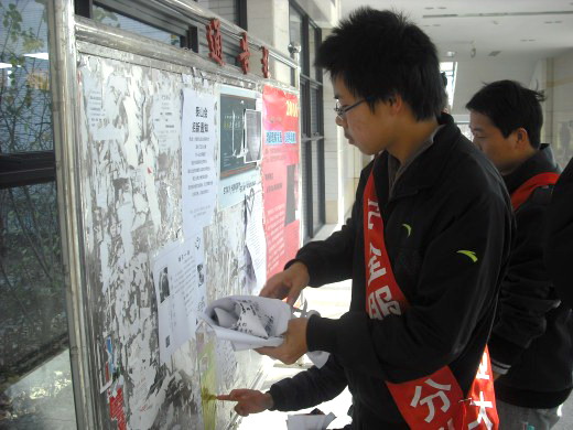 服务分队B组在公教一区,三区顺利开展了清理、擦洗公告栏的义务活动。B组组长杨成到场组织工作,B组全体组员悉数参加。