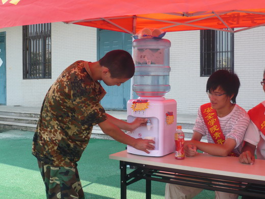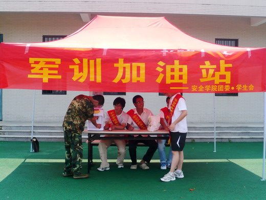“军训加油站”帐篷内为军训的新生和教官提供了乘凉的场地和充足的饮用水,同时还备有创可贴、藿香正气水、碘酒等必备医药用品以备不时之需。每天规定时段有团委学生会工作人员值班为军训的新生服务,负责饮水、药品的补给和更换,并帮助新生和教官保管相关物品。