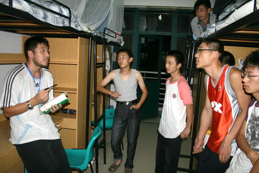 10点钟,各位干部来到了自己负责的宿舍。新生们对各位学生会干部的到来表示热情的欢迎,他们纷纷围在干部们的周围,热情的聊了起来。各位干部都倾囊相授,他们首先询问了新生们初来学校的各种感受以及生活上的问题。接着,各位干部就大学学习与每一位新生进行了深入的交流,并告诫新生们:大学是锻炼自我的一个很好的平台,一定要抓紧每一次机会来提高自己各方面的能力。各部门的负责人也向各位新生介绍了自己的部门,为以后招新打下一个基础。