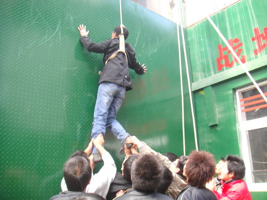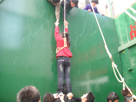 踏入“探路者”训练营,大家就被紧张其的氛围所吸引,在教员的要求下,同学们为自己的团队确定了队长、队名、队训以及队歌。一切就绪之后,队员们迎来教员布置的第一道训练科目:穿越沼泽。队员纷纷献计,最后大家齐心协力,快速完美的通过“沼泽”。正当大家气喘吁吁之时,第二个项目开始:风雨同舟。队员们被分成了两个小队对抗,最终1队以较好的忍耐力与配合取得了胜利。。面对最惊险,也是最艰难的第三项目:高墙逃生,队员们必须徒手全部爬上令人生畏的4.2米高墙。一番精密策划之后,队员们采取叠罗汉的方法,以不怕苦、不怕累的精神,使得这面“夺命墙”变成了“胜利墙”。训练营里留下了同学们的汗水和笑声。