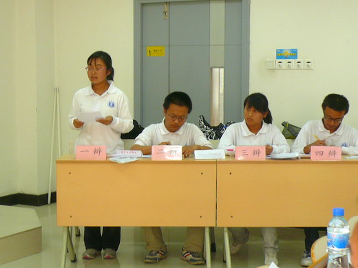 09级新生辩论赛”决赛于教五A202顺利举行。本次辩论赛正方是安全09-4班,辩题为“在校大学生知识积累比道德修养更重要”,反方为安全09-1班,其辩题为“在校大学生道德修养比知识积累更重要”。09级辅导员刘筱婕老师,07级优秀辩手于超轶,08级优秀辩手王林生、南锦博担任本次辩论赛评委,袁文静同学担任此次比赛主席。