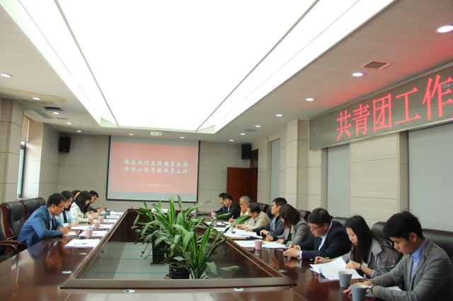 在矿业科学中心A412举行了共青团改革专项工作调研会。院党委书记章毛平、副书记钱雄、消防工程专业建设负责人朱国庆、团委书记孙婷、辅导员刘世通、陶冰冰及“挑战杯”备赛组成员参加了此次座谈会。