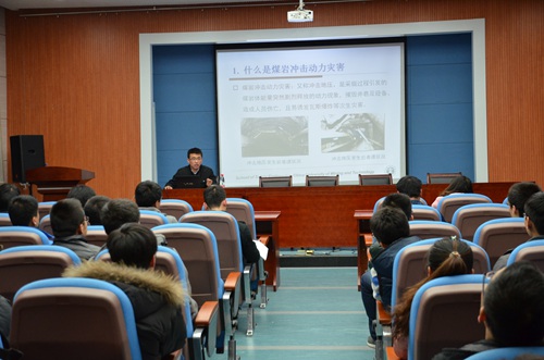 报告期间,刘晓斐老师就“煤岩冲击动力灾害预防研究”课题的研究现状、研究内容成果和研究展望等方面知识进行了讲解。刘晓斐老师首先向大家展示了国内外煤矿煤岩冲击动力灾害的发生情况和造成的危害;介绍了当前煤岩冲击动力灾害预防研究体系;随后,他向大家阐述了区域监测、局部监测、区域防治、局部防治等概念;讲座最后,他给同学们提供了煤岩冲击动力灾害预防技术的研究思路。报告最后,刘晓斐老师就大学生科技创新计划的问题和大家进行探讨,希望同学们能够踊跃的加入相关的创新实践训练之中。报告期间,同学们积极听讲,认真做笔记,现场学术气氛浓厚。