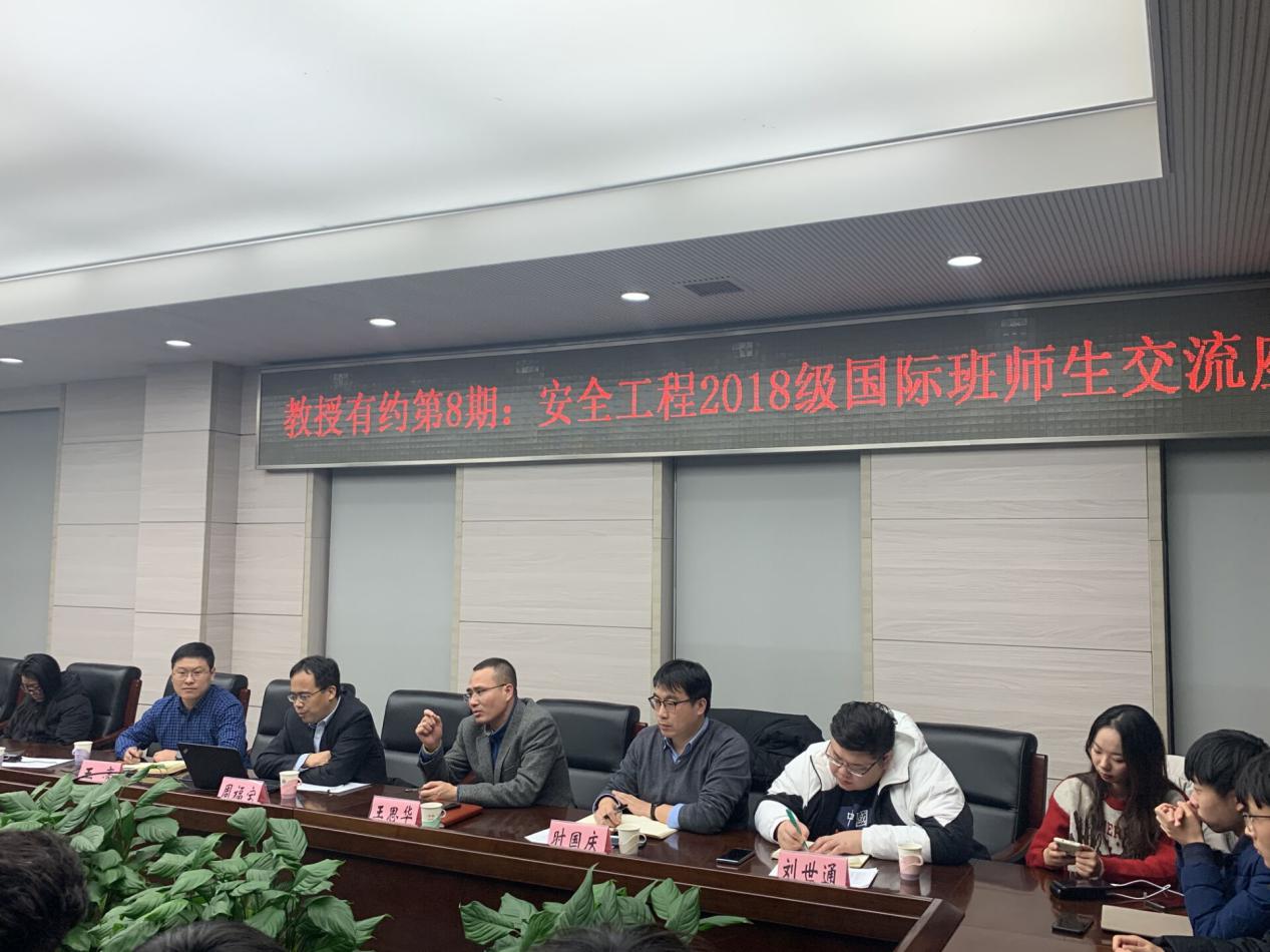 第八期“教授有约”——安全工程2018级国际班师生座谈会在矿业科学中心A412举办。副校长周福宝教授主讲。院党委书记王思华、2018级国际班班主任时国庆副教授、学工办主任刘世通以及2018级国际班全体学生参加本次活动。活动由王亮副院长主持。