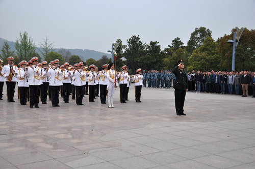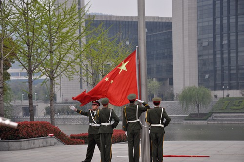 六点四十五分,升旗仪式正式开始,鼓乐队奏起慷慨激昂的乐曲,国旗班同学身着军装,摆成方阵踏步前进。待国旗班同学全体站定,国旗手迅速向前束紧国旗。国歌响起,随着国旗手将国旗抛开,全体同学唱着国歌,对国旗行注目礼。鲜艳的国旗冉冉升起,在晨风的吹拂下飘动,国歌唱响在每个人的心里,同学们无一不被打动。升旗结束后开始升校旗,青春的校歌奏响,每个同学都跟着哼唱起来。七点零五分,升旗仪式圆满结束,同学们有序离场。