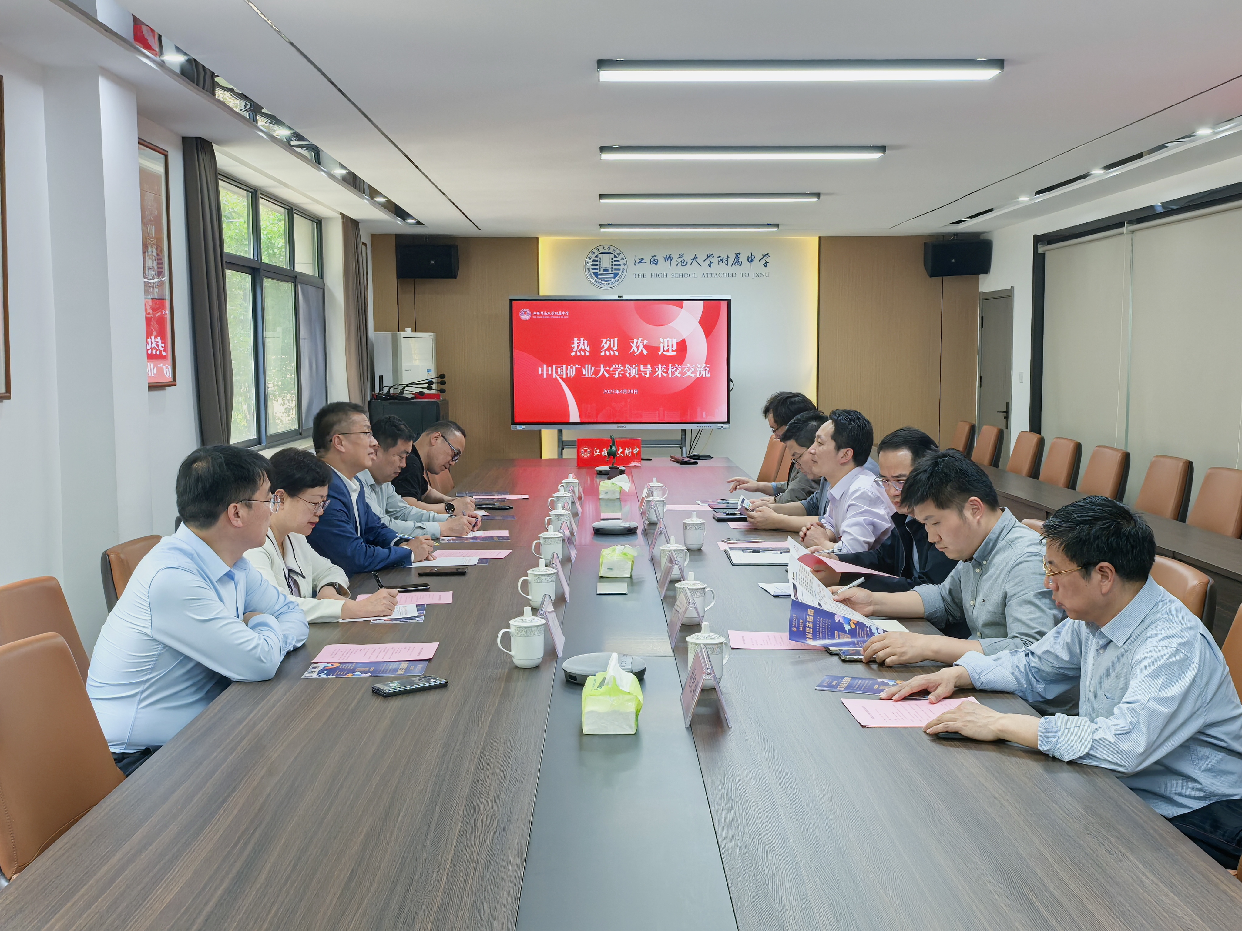 在江西师范大学附属中学、南昌市新建区第二中学交流座谈时,黄军利介绍了中国矿业大学的办学历史与学校近年来的发展情况,并就大中衔接人才一体化培养路径、共育拔尖创新人才等方面提出合作展望,江西师范大学附属中学校长朱斌、南昌市新建区第二中学副校长黄春华分别介绍了中学近年来教育教学情况和人才培养成效。座谈交流环节,双方就大中课程衔接、科普讲座、生涯规划等方面进行了深入交流,并达成持续深入合作的意向。